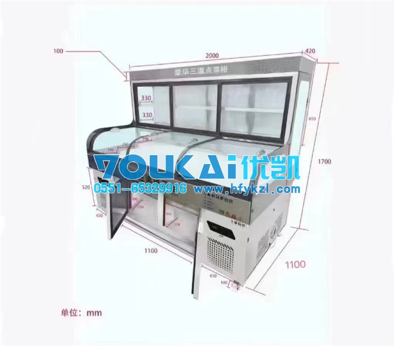 三溫點菜柜,上冷藏2~8℃,中間0~-5℃,下面冷凍-16℃。頂部燈箱可以刻字,上層中空玻璃,中間鍍膜熱彎防霧玻璃,尺寸可定制。
